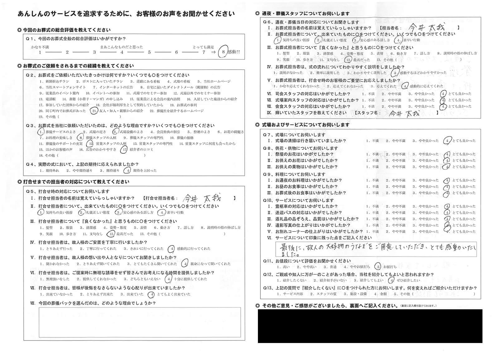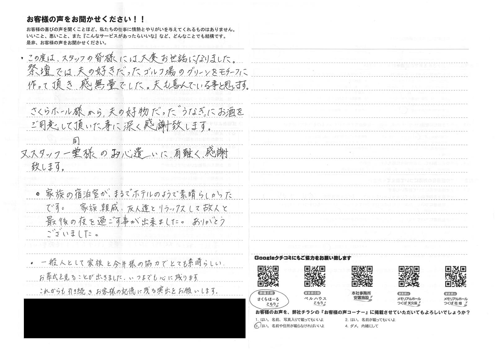 この度は、スタッフの皆様には大変お世話になりました。祭壇では、夫の好きだったゴルフ場のグリーンをモチーフに作って頂き、感無量でした。夫も喜んでいる事と思います。