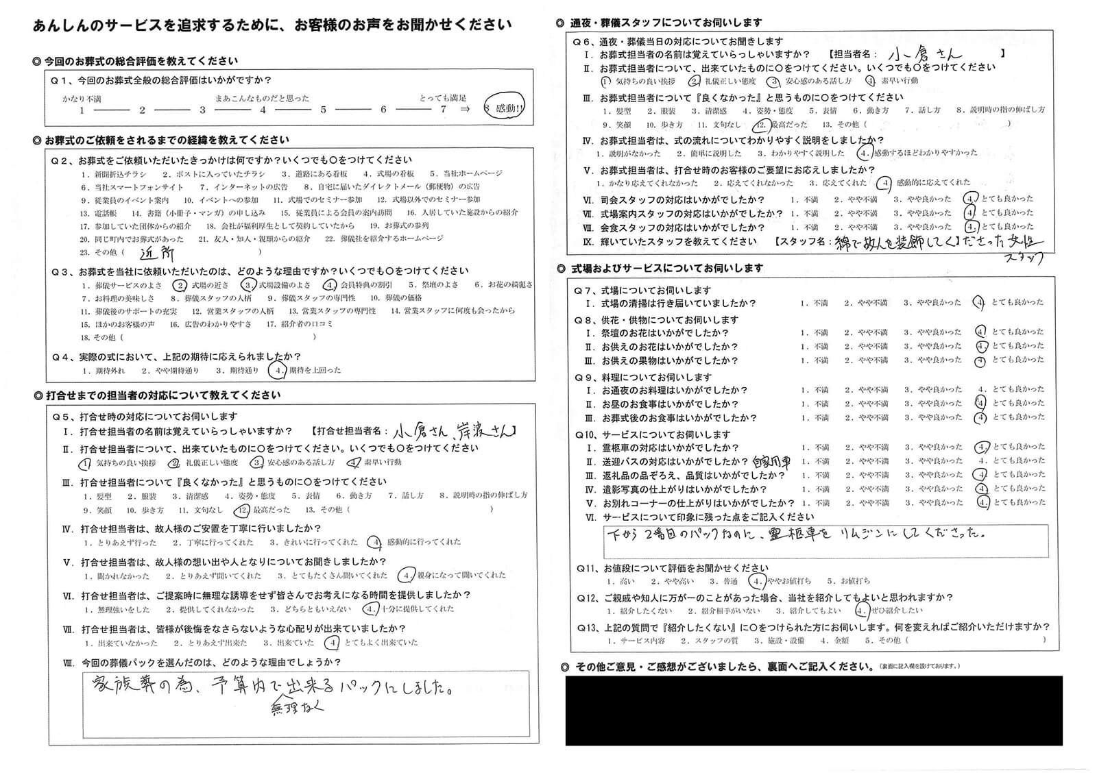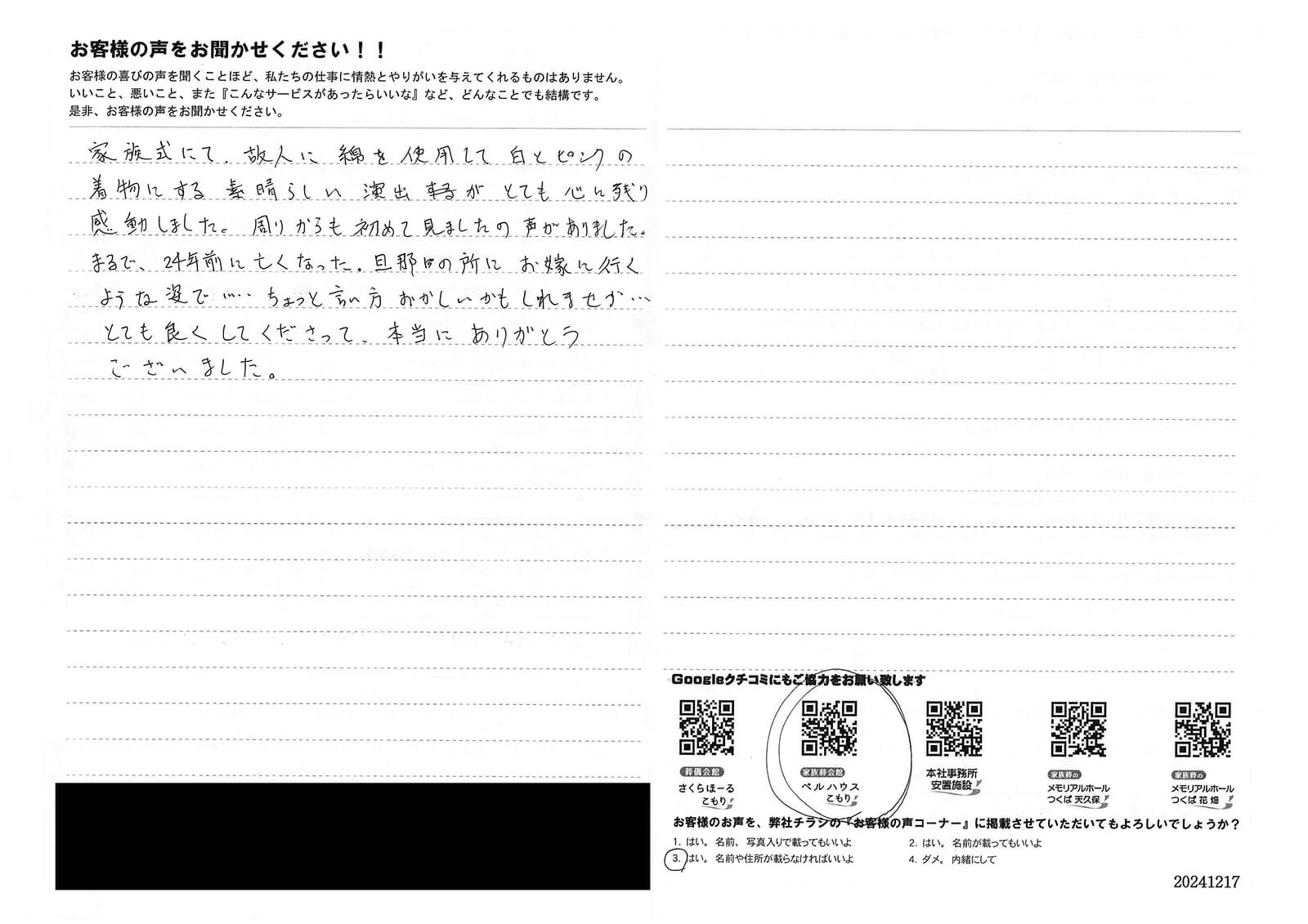 家族式にて、故人に綿を使用して白とピンクの着物にする素晴らしい演出がとても心に残り感動しました。周りからも初めて見ましたの声がありました。まるで、24年前に亡くなった旦那の所にお嫁に行くような姿で… ちょっと言い方おかしいかもしれませんが…